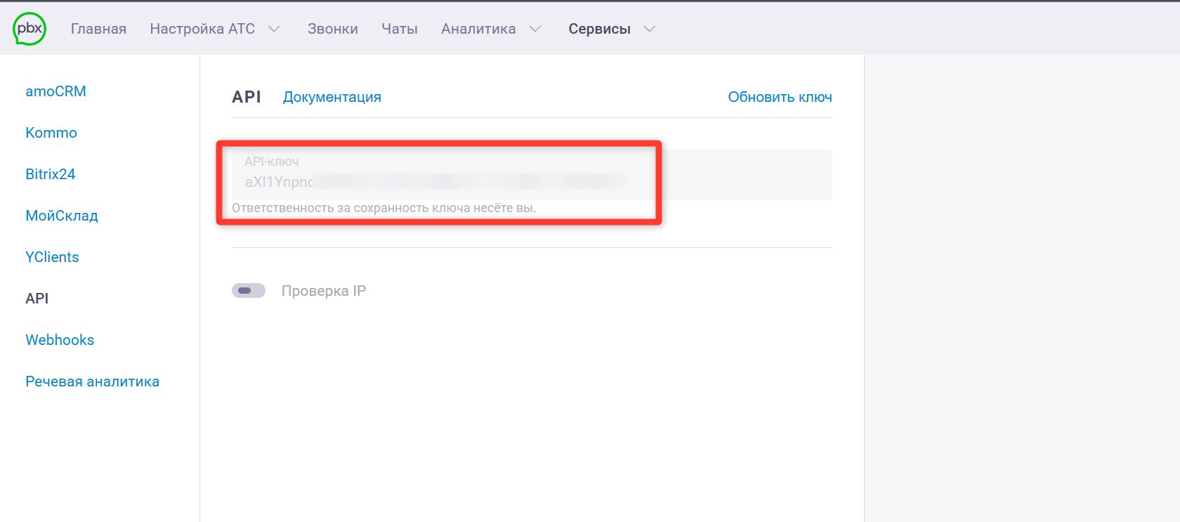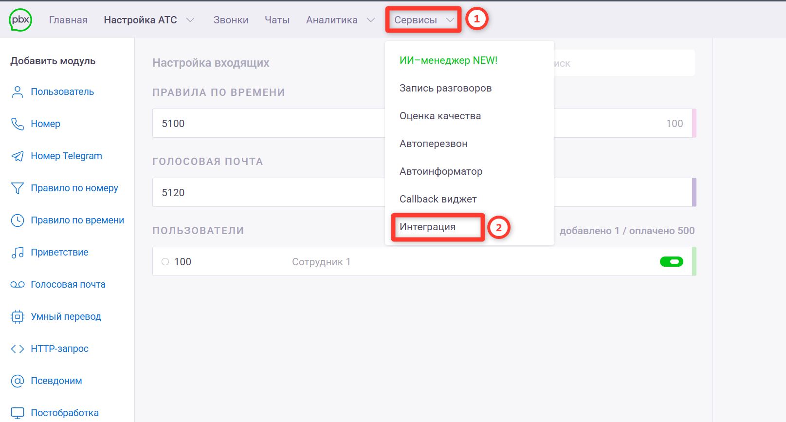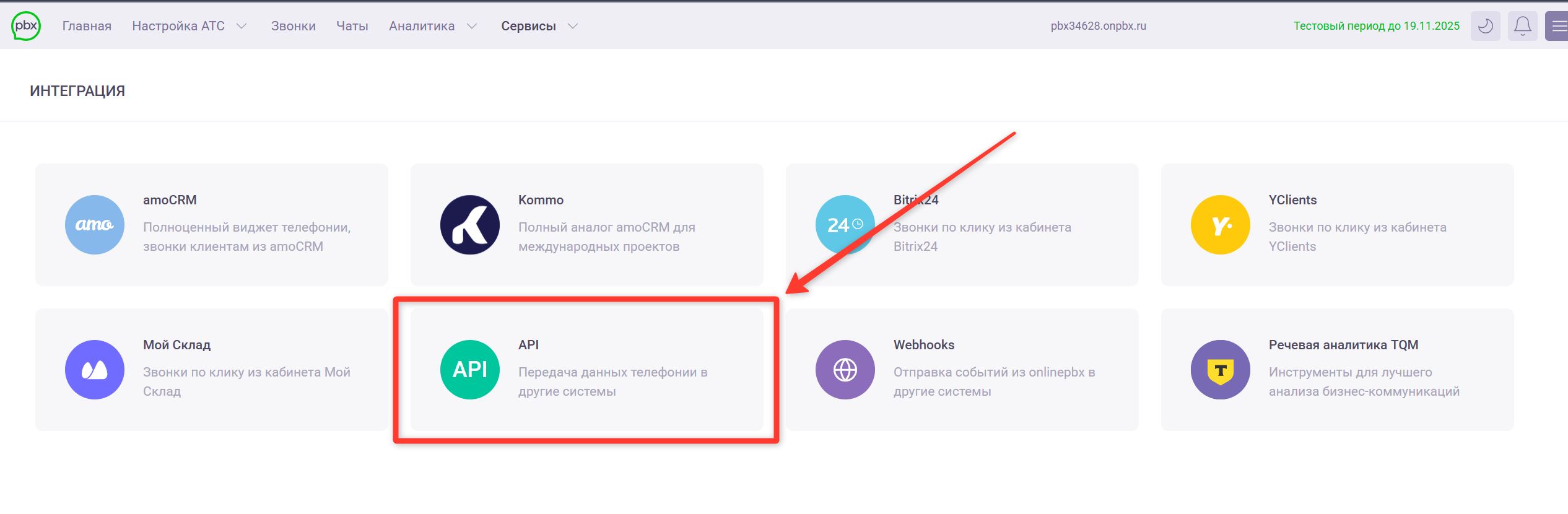 После того, как вы настроили телефонию в onlinePBX, вам необходимо перейти в «Сервисы -> Интеграция»