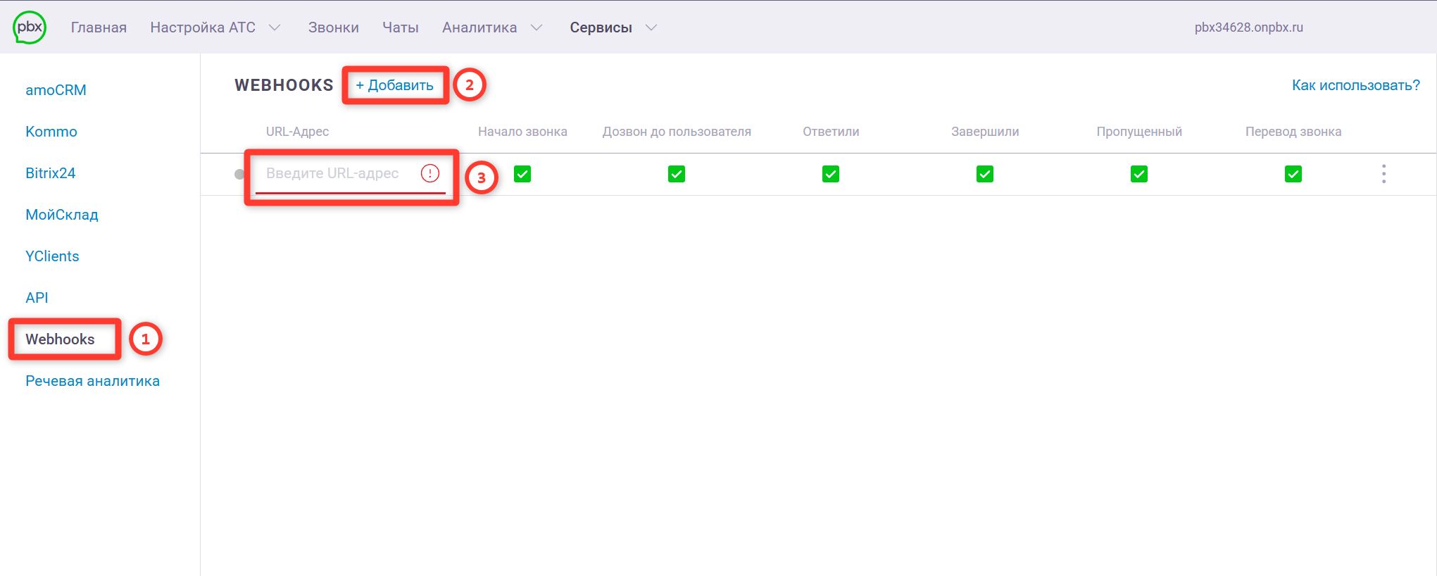 Теперь нужно зайти в раздел «Webhooks», добавить новый вебхук и указать в нем адрес вашего вебхука OnlinePBX: https://вашдомен.docrm.org/api/phonerapi/onlinepbxwebhook