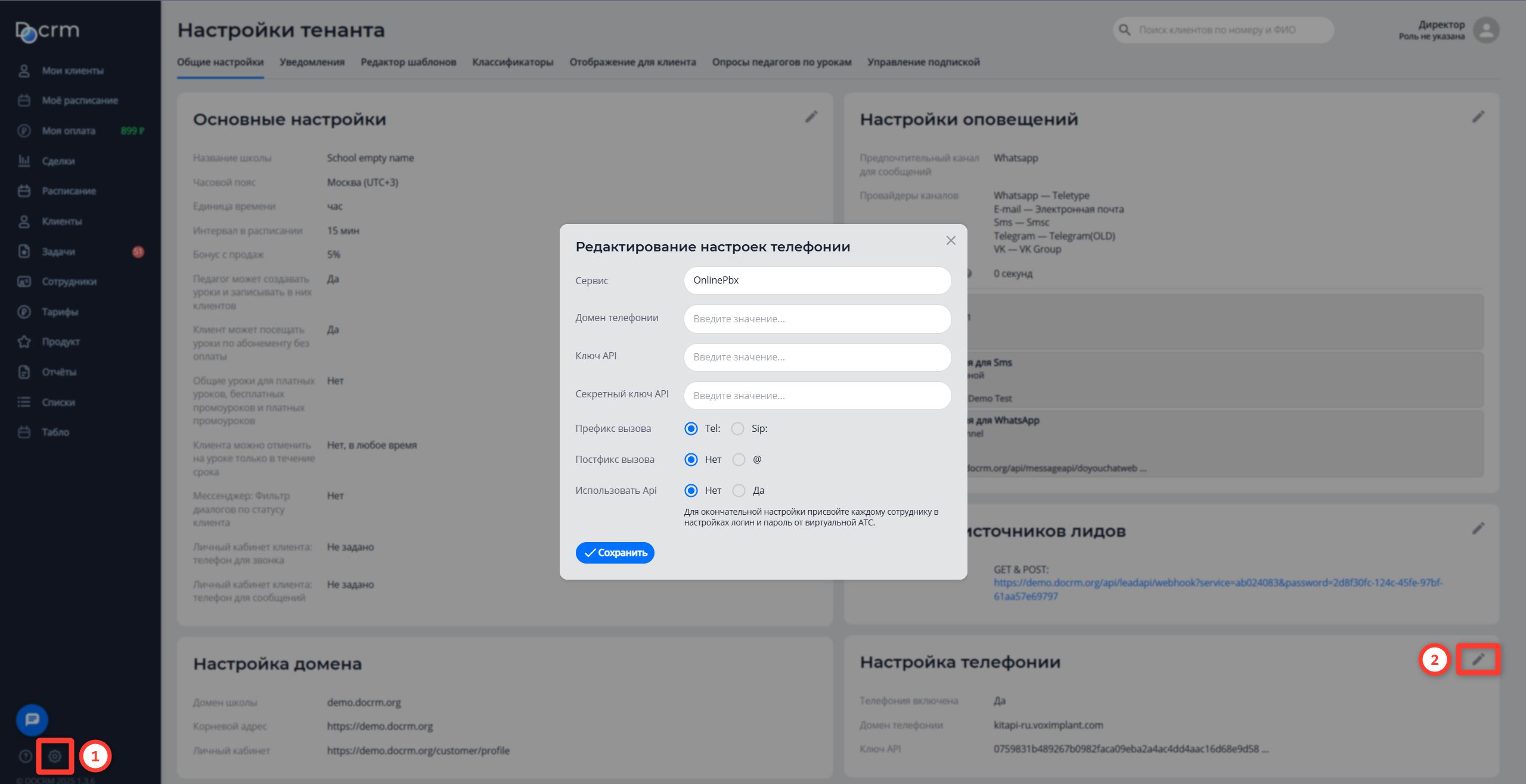 Заходим в Настройки «DoCRM -> Настройка телефонии»