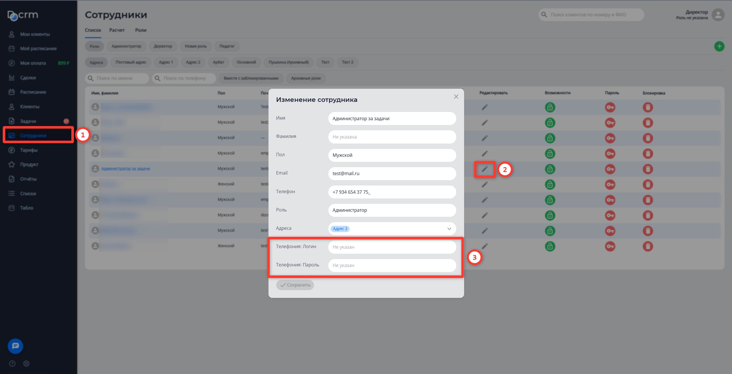 onlinePBX интегрирован в DoCRM. Теперь вам осталось только перейти в раздел «Сотрудники» и назначить логин/пароль настроенных "пользователей" из onlinePBX соответствующим учетным записям в DoCRM