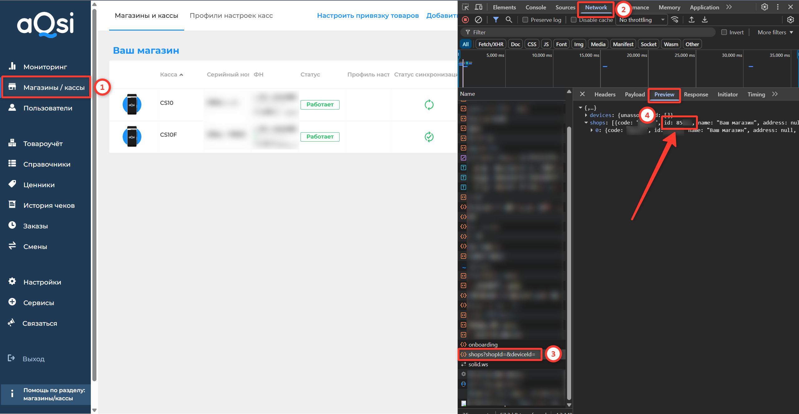 Вас интересует файл shops?shopId=&deviceId=... - нажимаете на него. Справа в строке shops будет атрибут «id:*****» - это и есть необходимый id кассы
