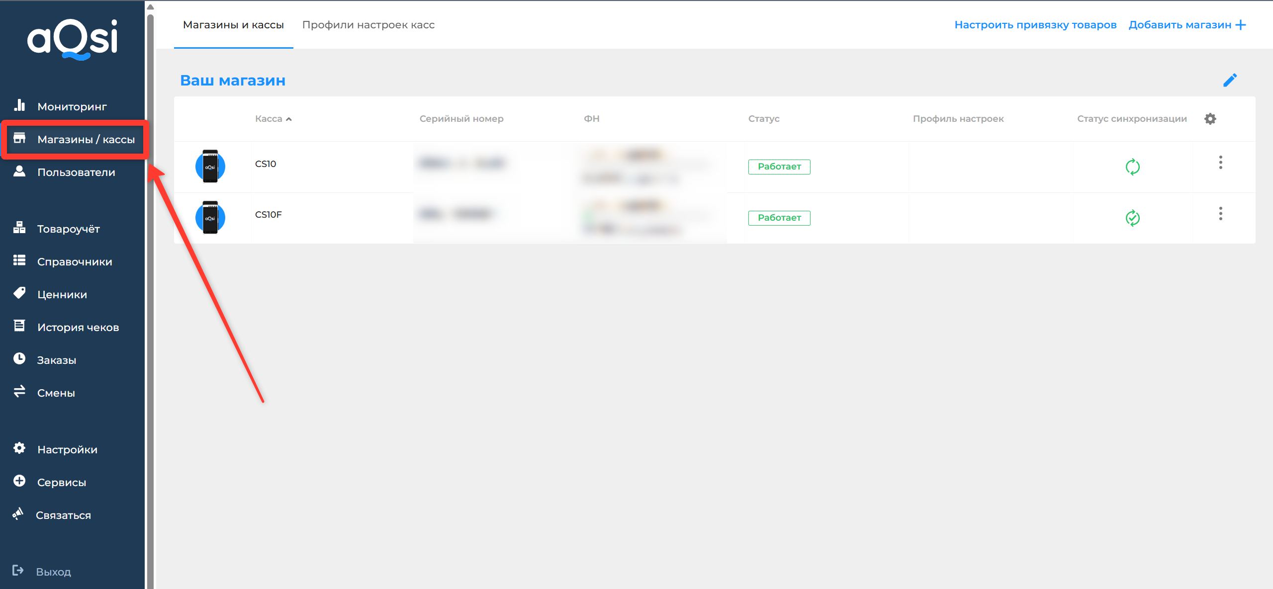 Для интеграции aQsi кассы в DoCRM нужно узнать ID вашей кассы и сформировать API ключ. Для этого необходимо зайти в свой личный кабинет в lk.aqsi.ru и перейти в раздел «Магазины», где отображаются ваши терминалы