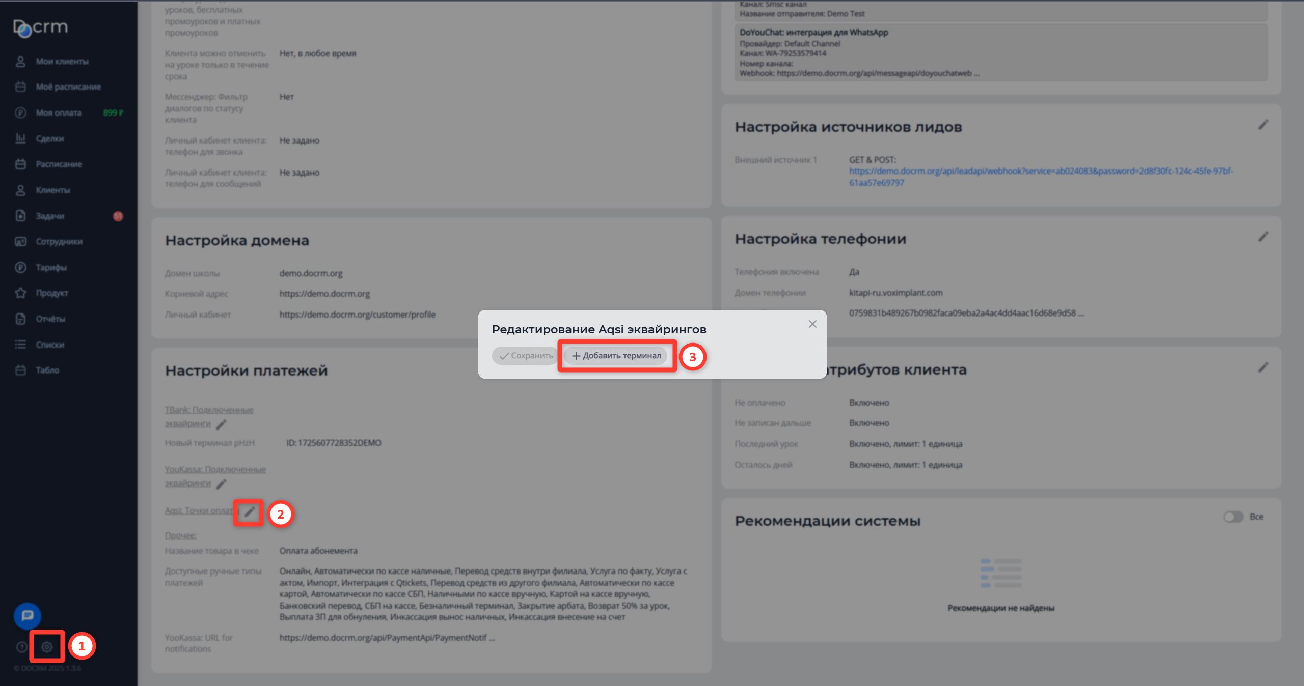 После этого копируете сгенерированный на предыдущем этапе API ключ вашей кассы и переходите в основные настройки DoCRM -> Настройки платежей -> Aqsi: Точки оплаты. Нажимаете «Добавить терминал»