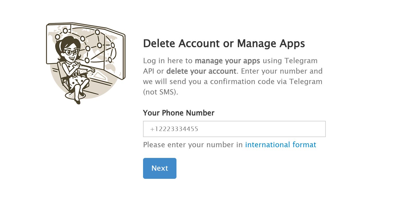 2. Вводите номер телефона, который привязан к вашему telegram-аккаунту, нажимаете Next