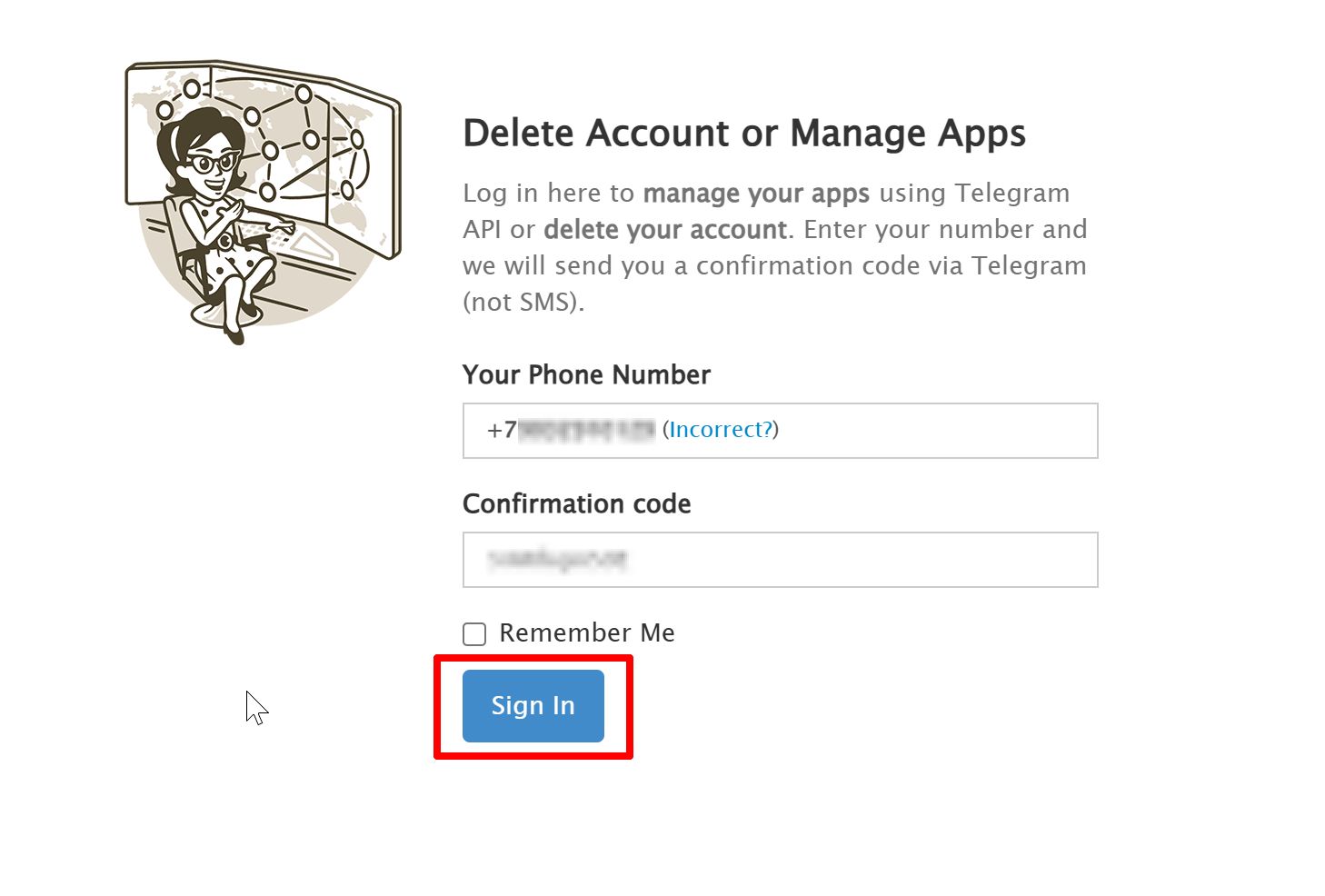 3. В ваш telegram-аккаунт придет код подтверждения, который нужно вставить в соответствующее поле, и нажать Sign In