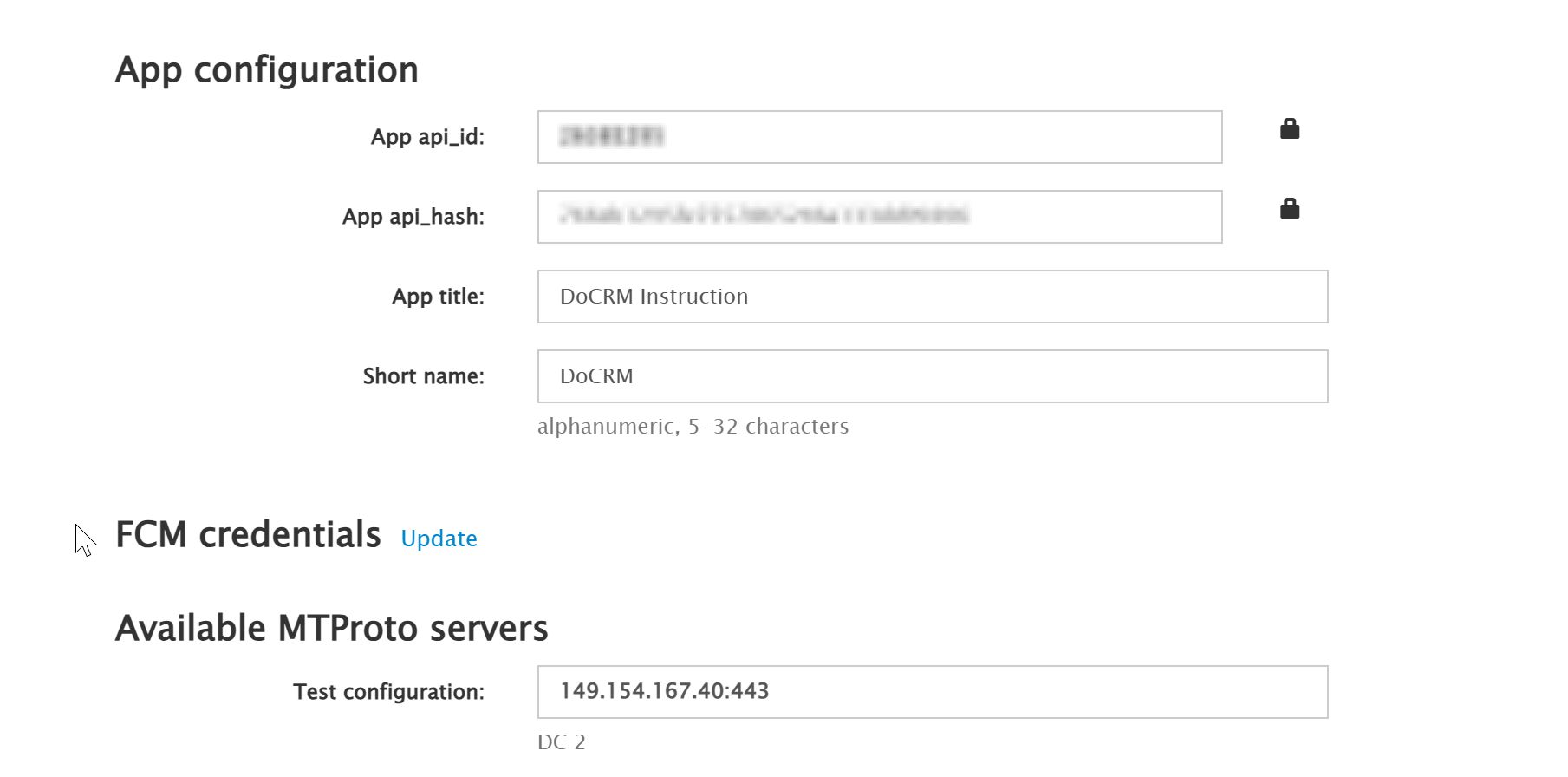 9. Теперь нам нужно заполнить появившиеся поля соответствующей информацией из раздела API development tools на сайте my.telegram.org: