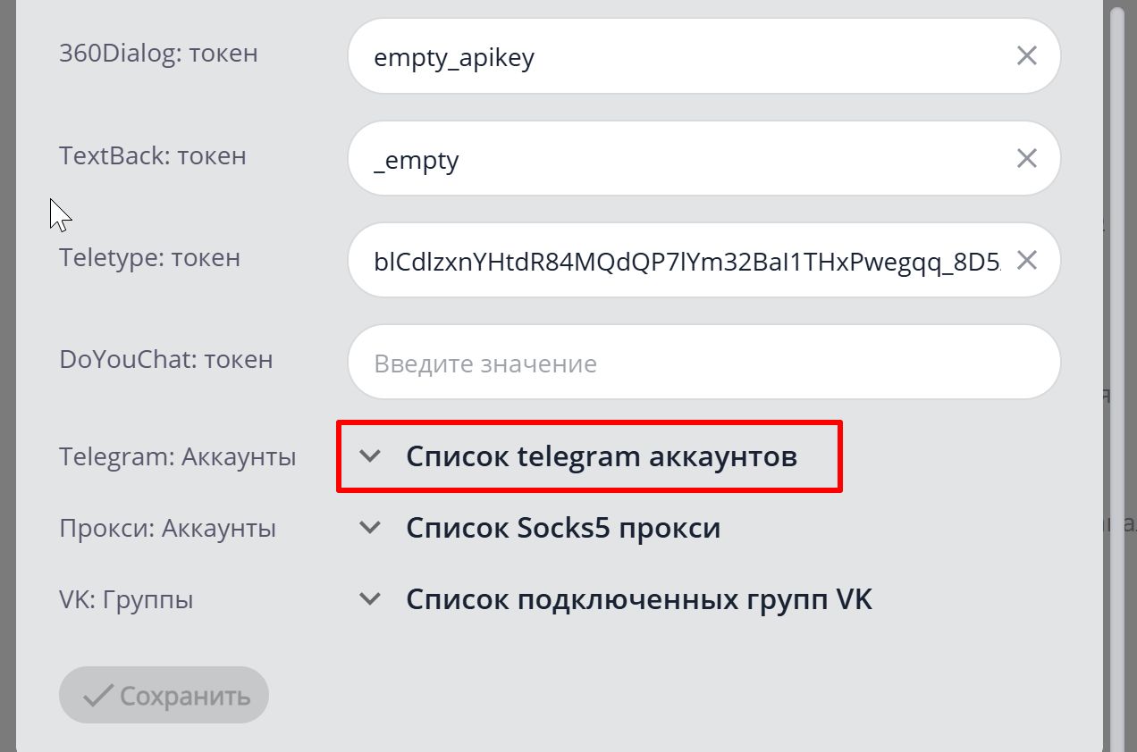 7. Раскрываете пункт Telegram: интеграции и нажимаете на кнопку Добавить интеграцию