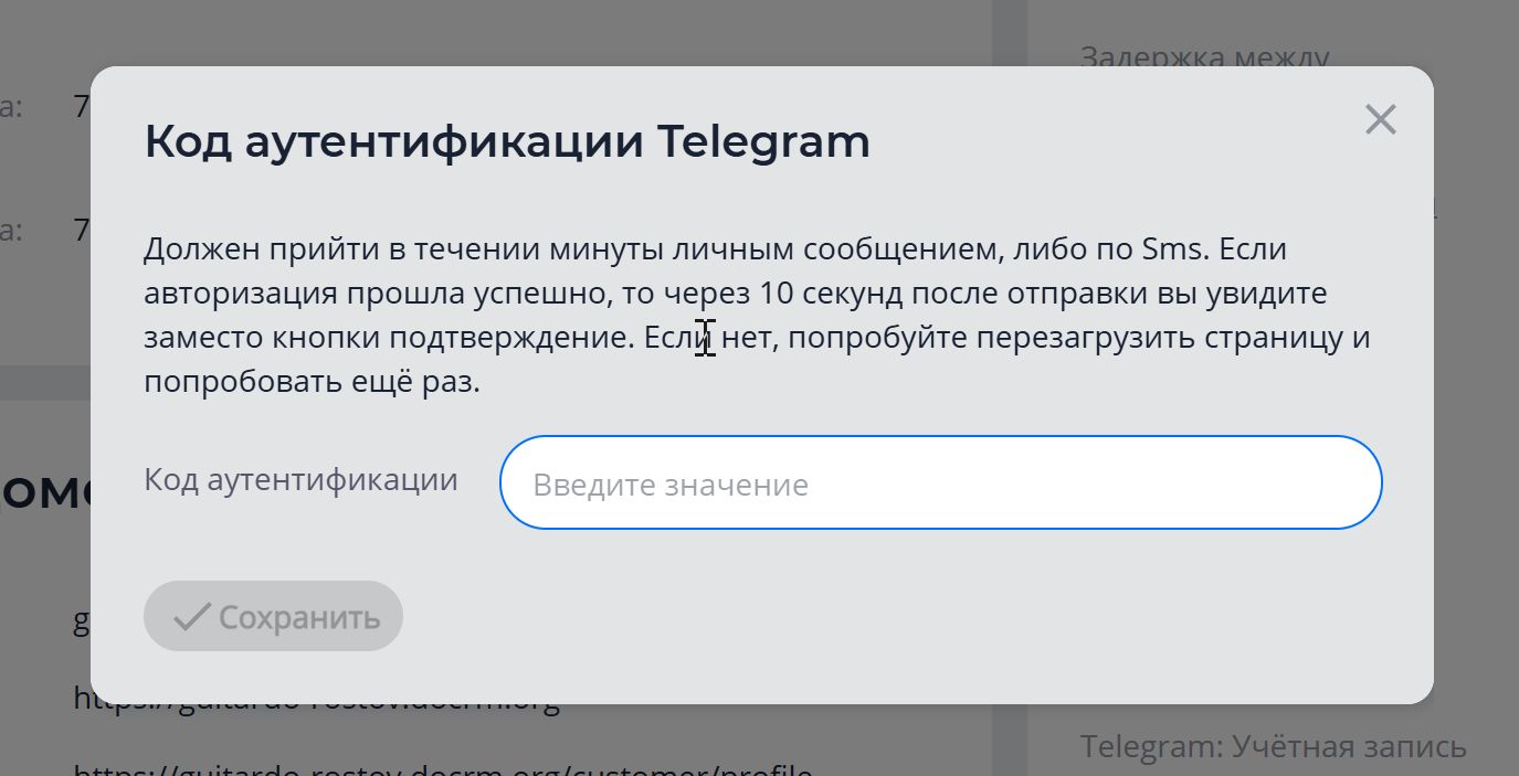 12. В ваш telegram-аккаунт придет код, который нужно вставить в открывшемся окне, и нажать Сохранить