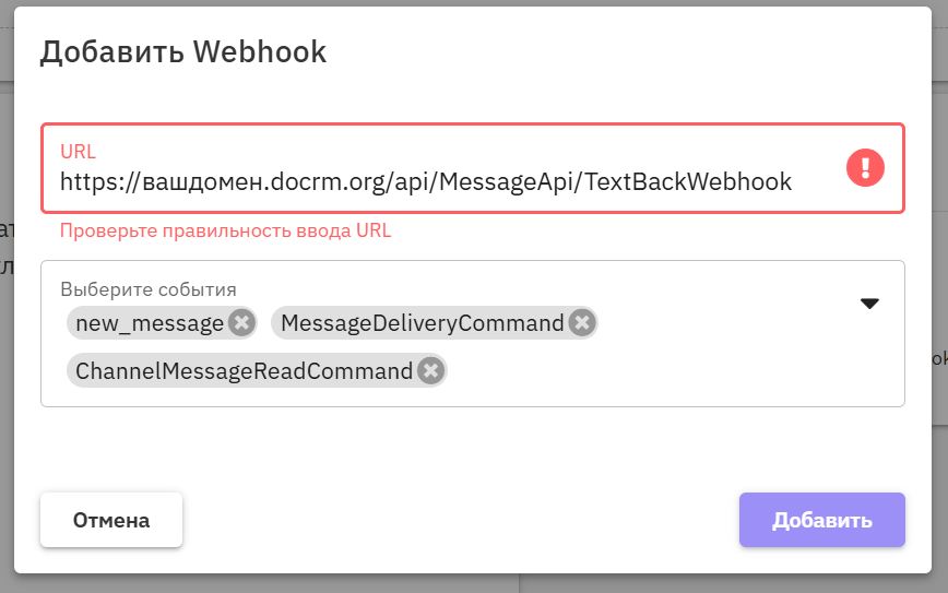 В этом окне вам необходимо указать адрес вебхука вашего тенанта DoCRM (https://вашдомен.docrm.org/api/MessageApi/TextBackWebhook) и отметить события «new_message», «MessageDeliveryCommand» и «ChannelMessageReadCommand»