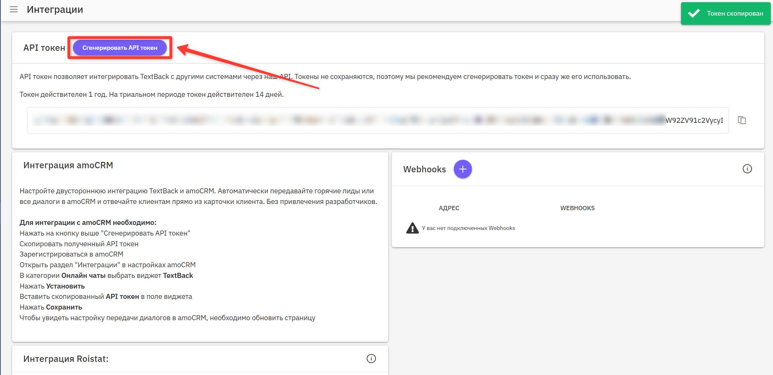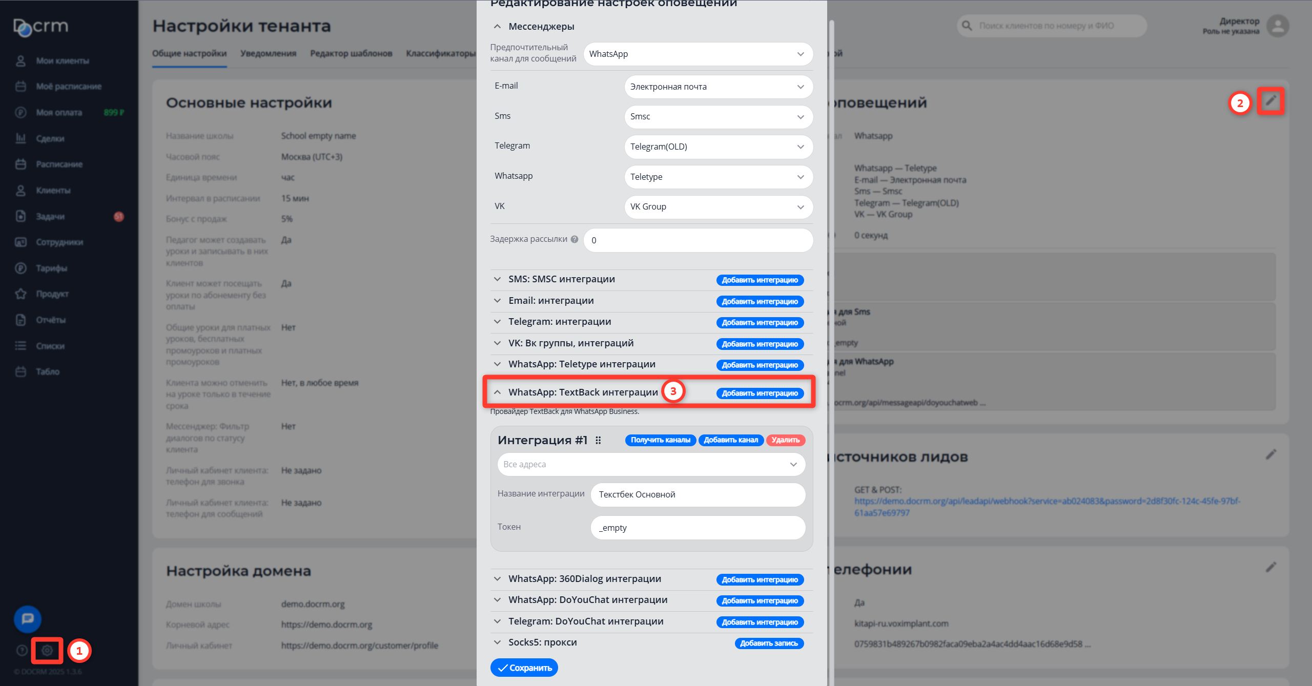 После этого копируете ваш «Токен» и переходите в основные настройки DoCRM -> Настройки оповещений. Добавляете интеграцию для TextBack