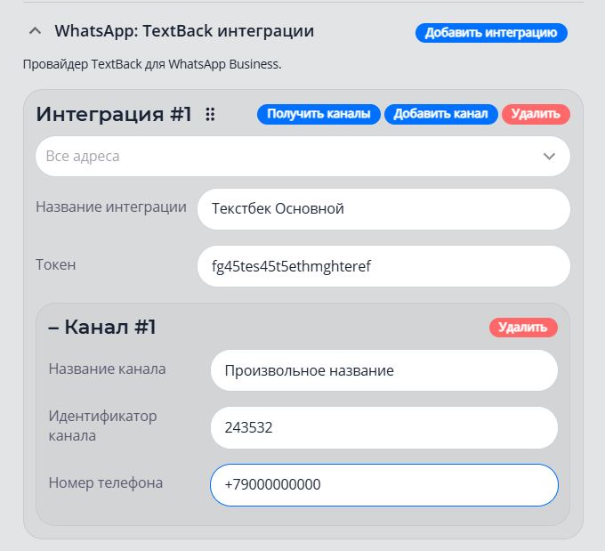 Указываете произвольное название интеграции. В поле Токен вставляете скопированный Токен из интерфейса TextBack и нажимаете «Получить каналы»