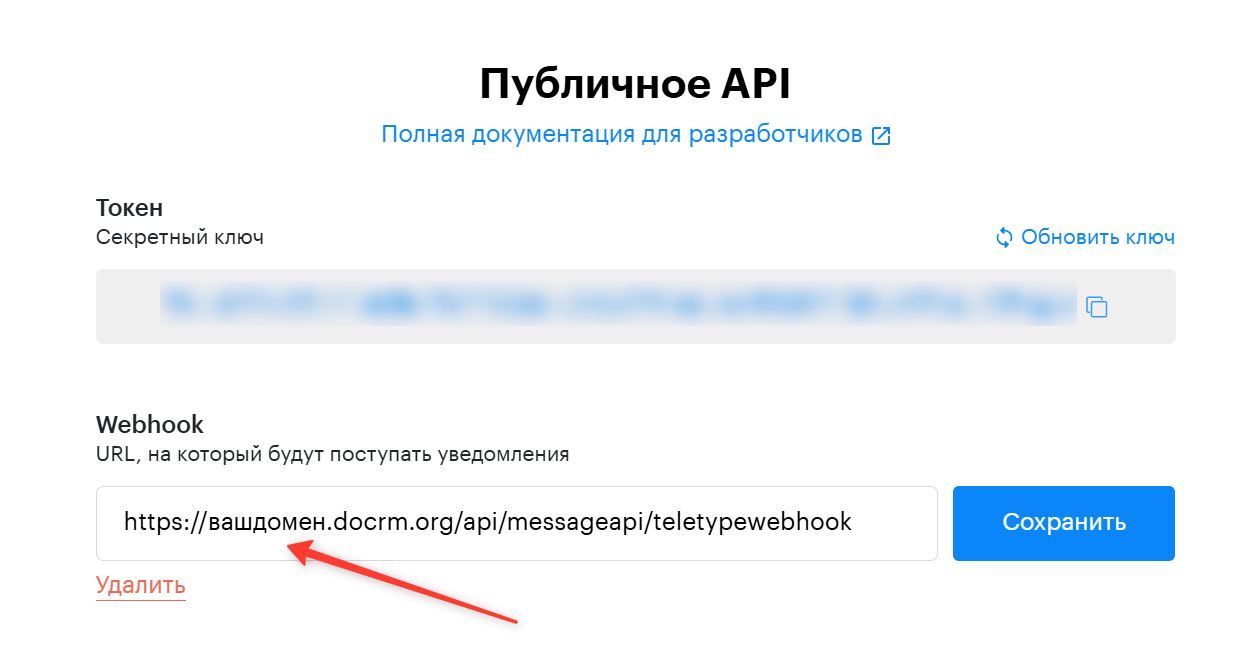 В этом разделе вам необходимо указать адрес вебхука вашего тенанта DoCRM (https://вашдомен.docrm.org/api/messageapi/teletypewebhook) и отметить события «Новое входящее сообщение» и «Отправка исходящего сообщения»