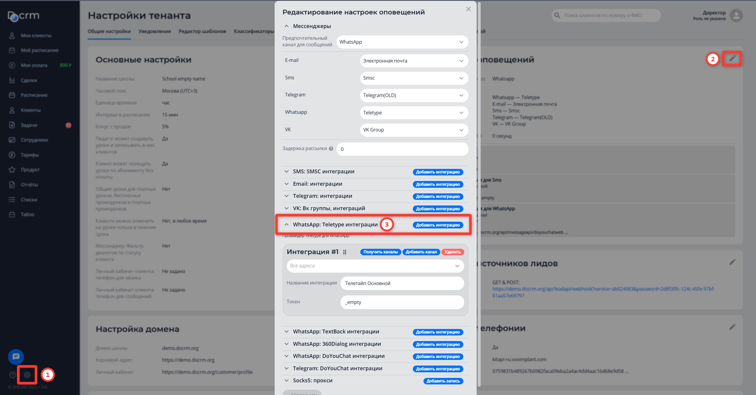 После этого копируете ваш «Токен» и переходите в основные настройки DoCRM -> Настройки оповещений. Добавляете интеграцию для Teletype