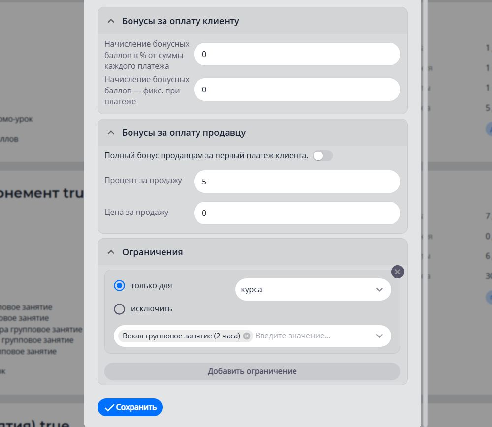 Далее идут блоки настройки бонусов клиенту, продавцу и ограничения