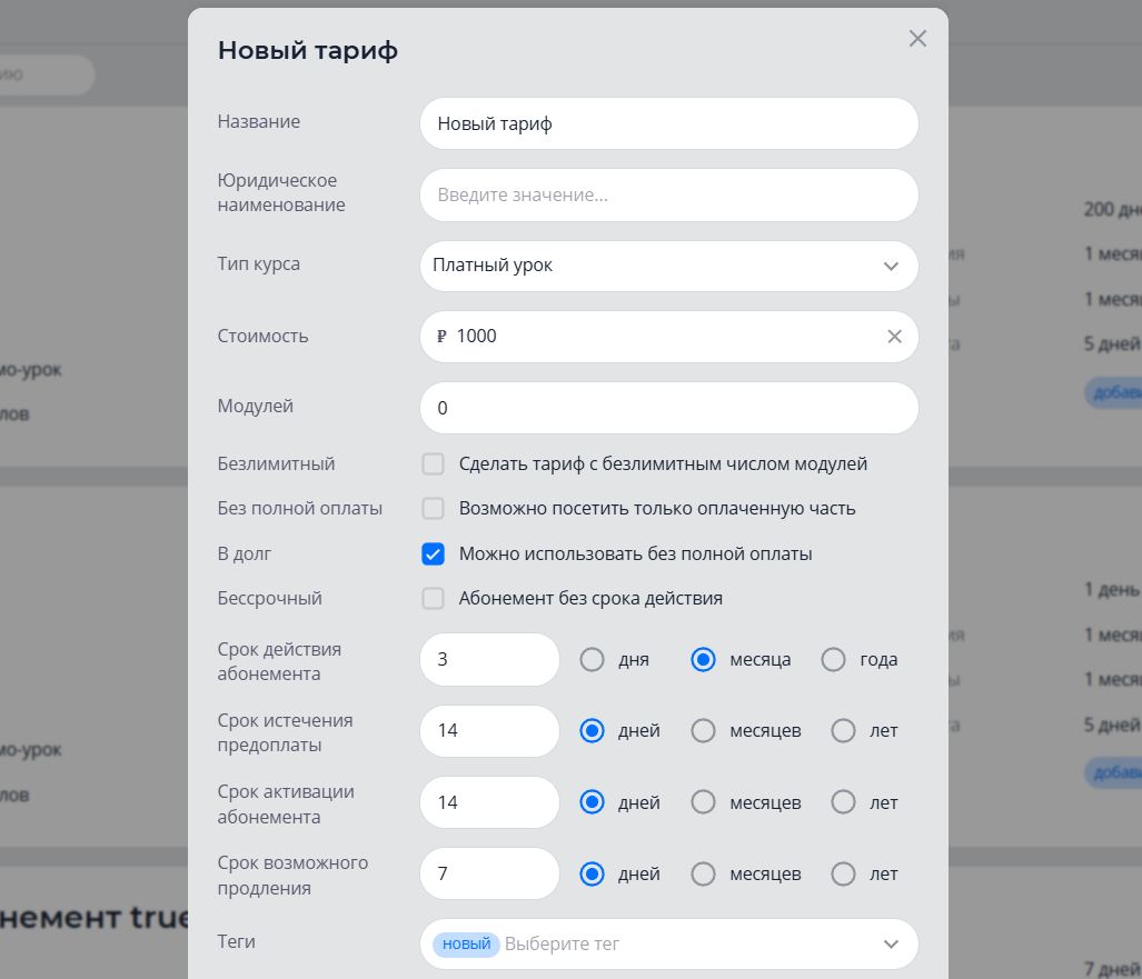 - Название - название тарифа, которое будет присваиваться созданным по нему абонементам и отображаться в системе